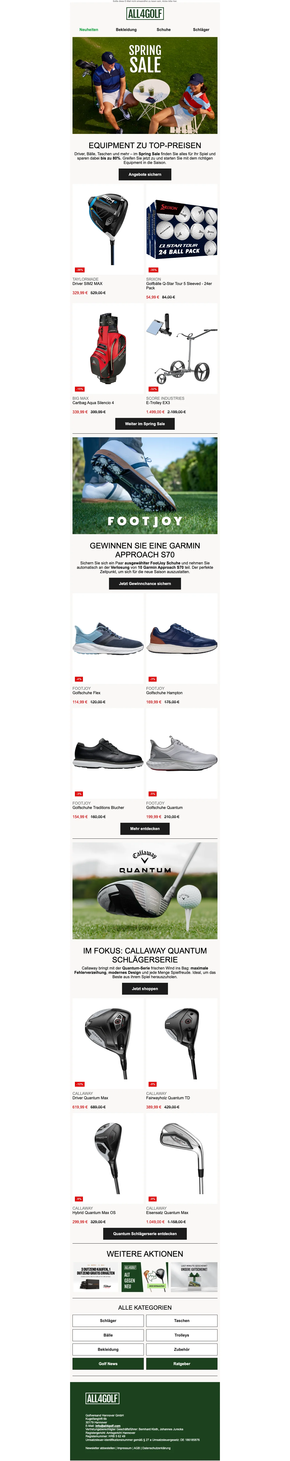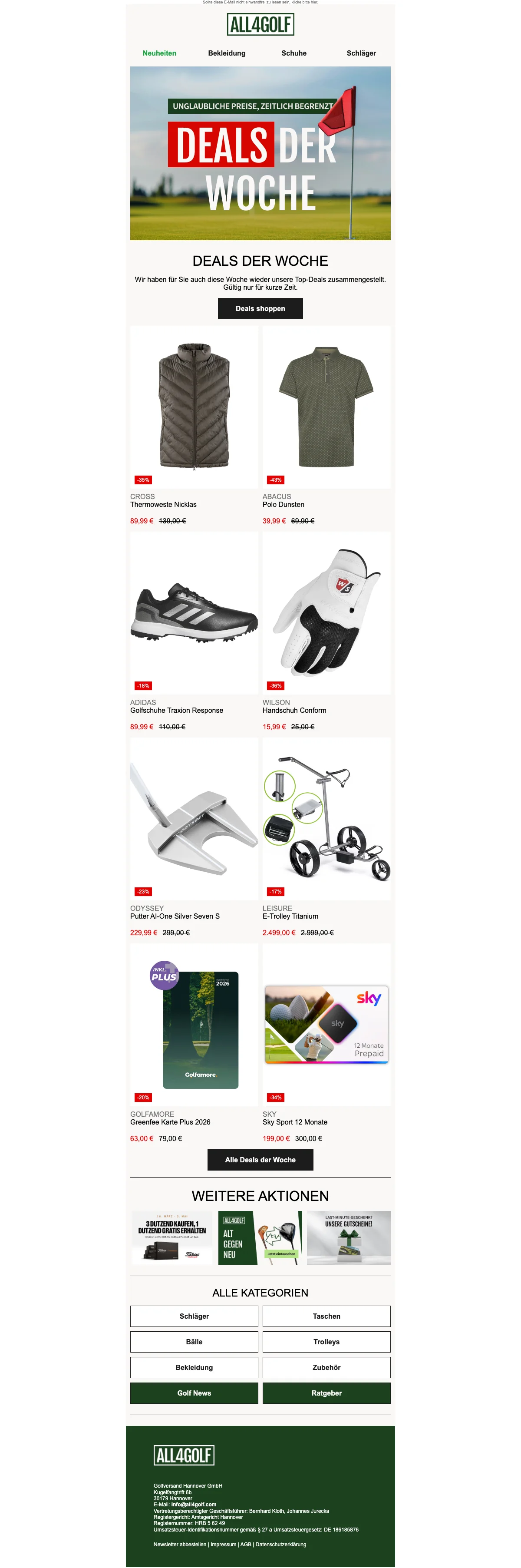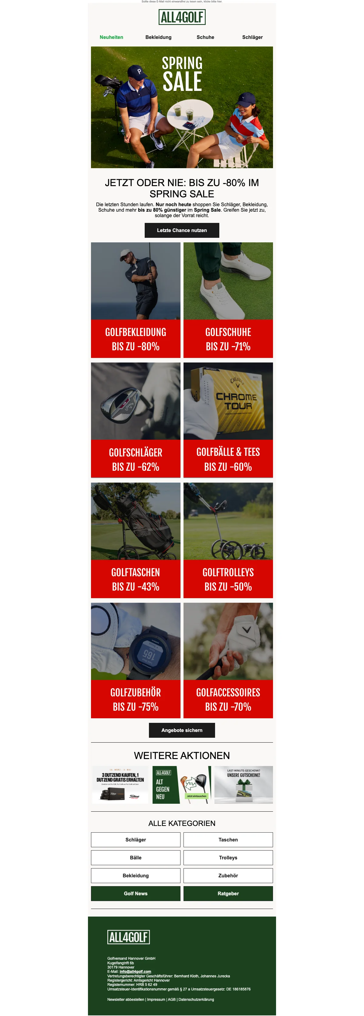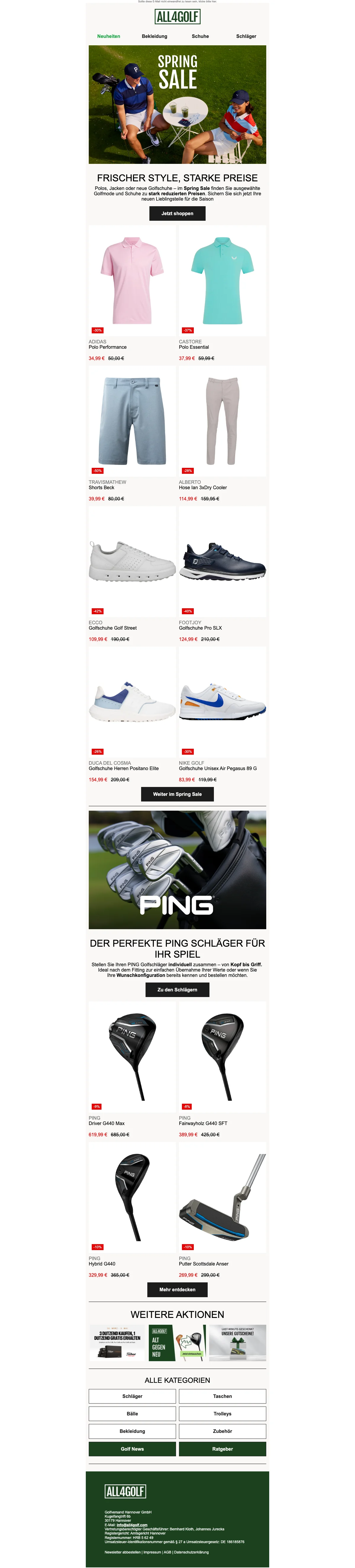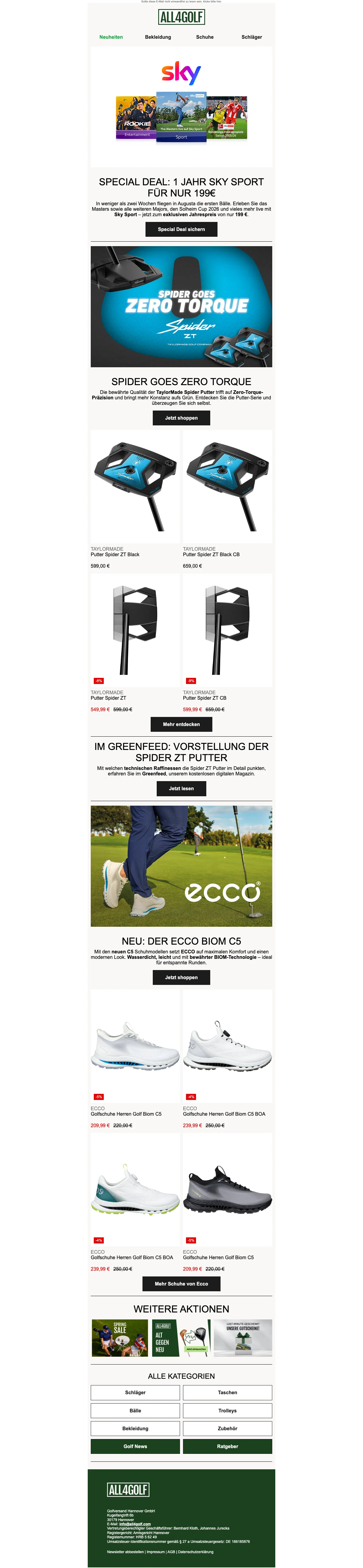 Bei All4Golf bekommst du Golfschläger zum reduzierten Preis. Bestell dir jetzt die besten Golfschläger auf ssl.all4golf.de und spare eine Menge Geld. Wähle zwischen Marken wie Nike, Cleveland oder Spirit of Green - die Auswahl ist dermaßen groß, hier wird jeder das Beste für dich finden. Durchstöbere jetzt das reichhaltige All4Golf Sortiment und profitiere von attraktiven Preisen.