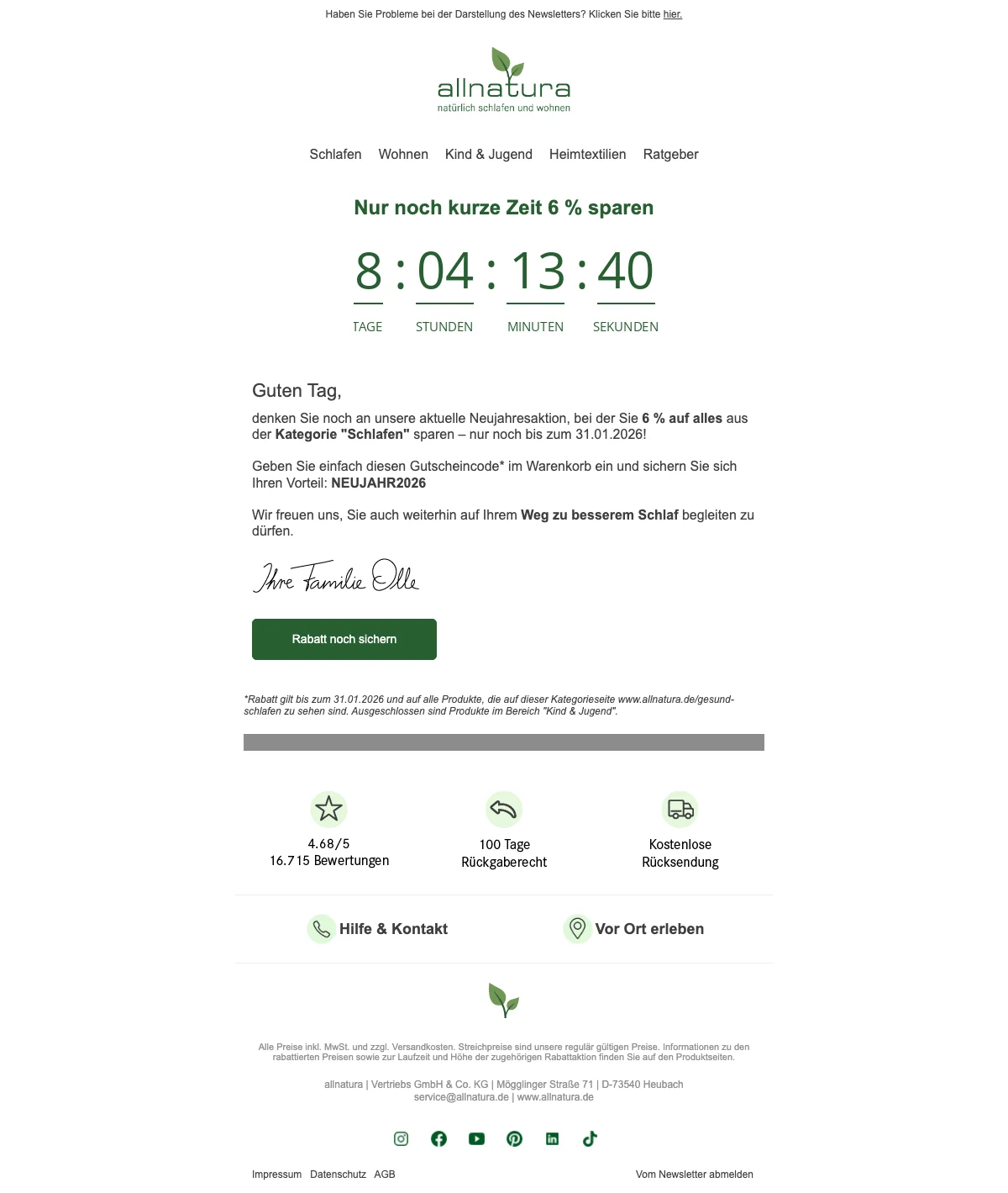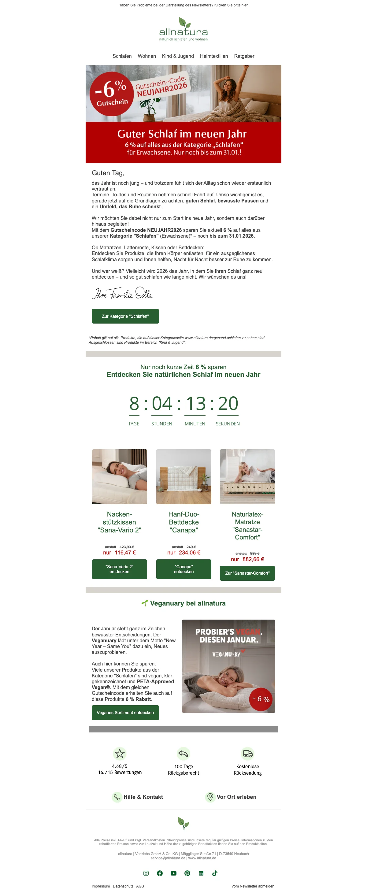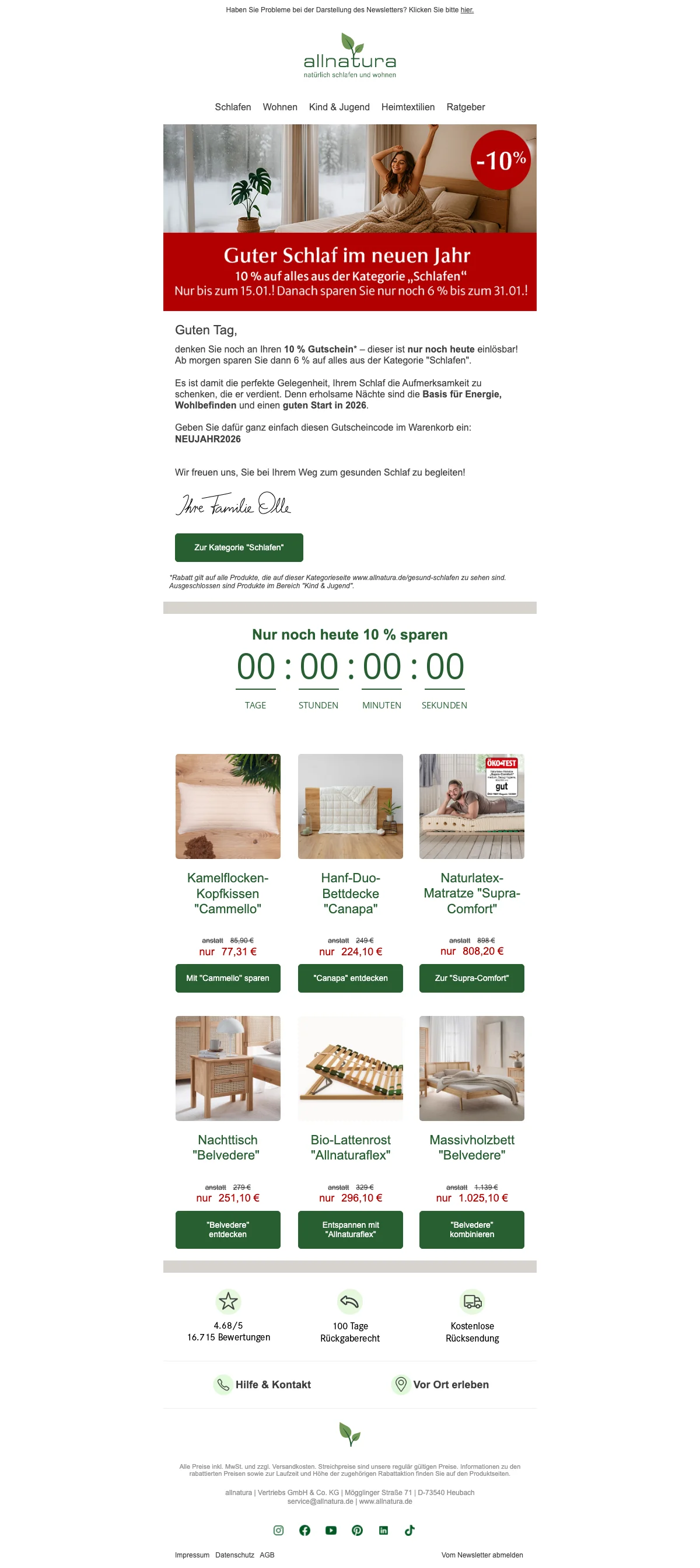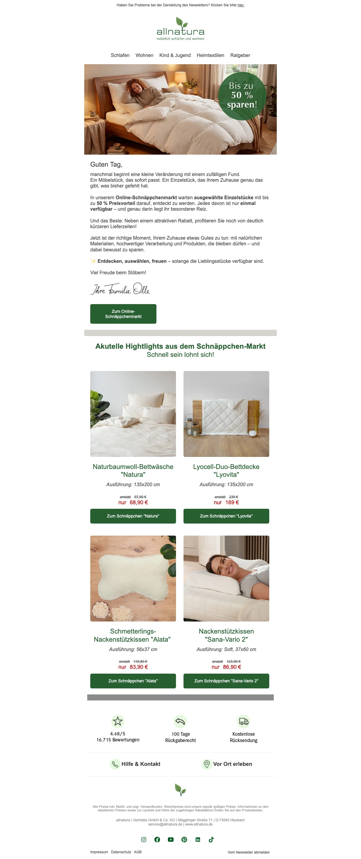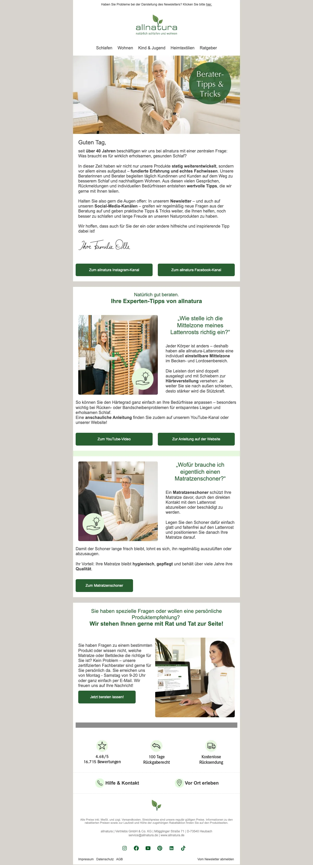 Seit über 35 Jahren bietet Allnatura ein breites ökologisches Sortiment für gesundes Wohnen und Schlafen an. Durch verschiedene Themenbereiche kann Wohnen auf neue Art und Weise entdeckt werden. Die Bereiche sind aufgeteilt in "Gesund schlafen" mit orthopädischen Matratzen, Lattenrosten, Boxspringbetten und generell Schlafzimmermöbeln aus Massivholz sowie Bettwaren aus Naturfasern. Der Bereich "Natürlich Wohnen" bietet Massivholzmöbel für jedes Zimmer Ihre Wohnung an. "Natürlich aufwachsen" begeistert Baby, Kind und Jugend mit altersgerechten Matratzen und Bettwaren sowie kindgerechten Holzmöbeln. Zu guter Letzt folgen im Sortiment der "Hautsympathischen Heimtextilien" kuschelige Teppiche, Yoga-Artikel sowie ein breites Heimtiersortiment aus Kissen und Decken. Die fachkompetente Onlineberatung verhilft Ihnen zur maßgeschneiderten, nachhaltigen Einrichtung für eine neue Wohlfühl-Oase. Saleduck.at bietet Ihnen mit wechselnden Angeboten auf das gesamte Sortiment an, sich ganz beruhigt neu einzurichten. So haben Sie mehr Freude beim Shoppen und sparen bares Geld. Allnatura.at ist mit seinem Angebot rund um den Schlaf- und Wohnbereich nicht umsonst der beste Online-Shop in Folge. Anregende Inspirationen zur Raumgestaltung anhand verschiedener Raumkonzepte findet man im Onlineshop genauso wie Geschenkideen für Frauen, Männer, Kindern und auch Haustieren.