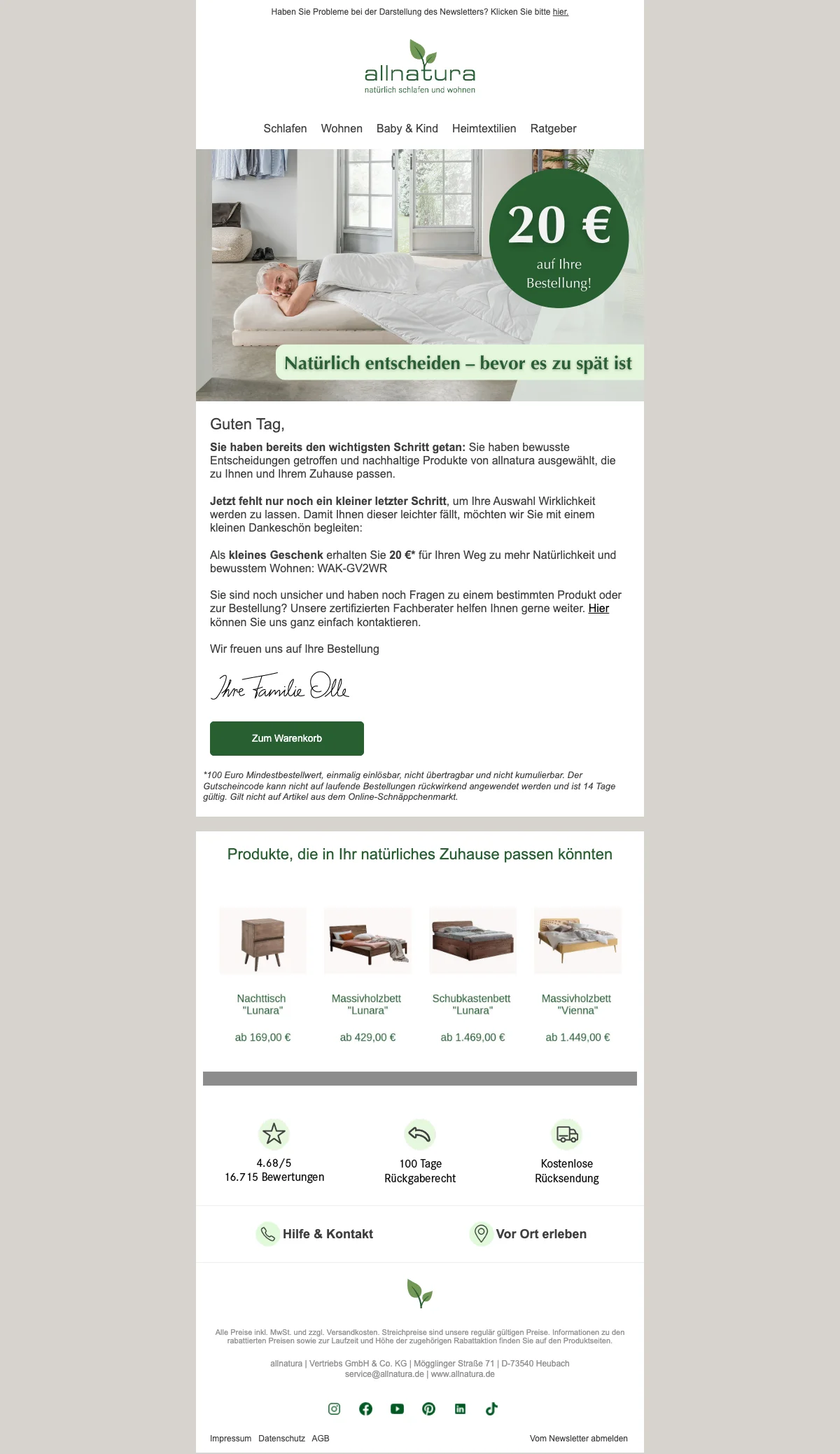 Der Allnatura Gutschein lautet WAK-GV2WR. Gib unseren Code für Allnatura 2026 im Checkout-Formular ein und sichere dir exklusive Rabatte. Allnatura gutschein: 20 € gutschein für wohntextilien ab 100 €.