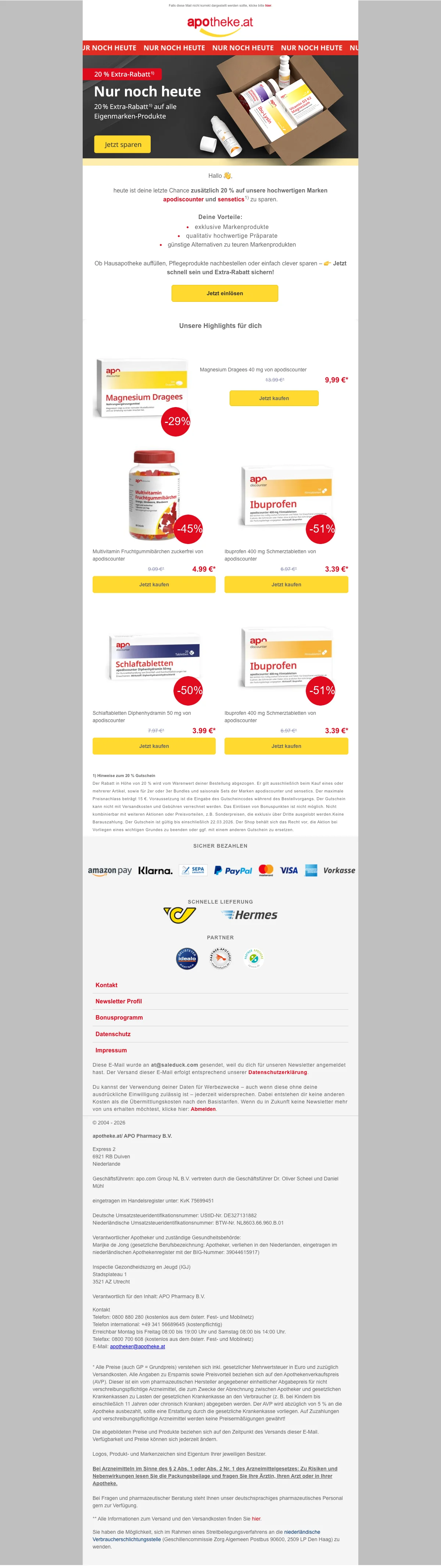 Sichere dir 20% Rabatt auf Iberogast Tropfen und Iberobiotics hilfreich bei Verdauungsbeschwerden. Angebot gilt ausschließlich für nicht rezeptpflichtige Artikel; pro Kunde ist nur ein Gutschein einlösbar und Kombination mit anderen Aktionen ist ausgeschlossen.