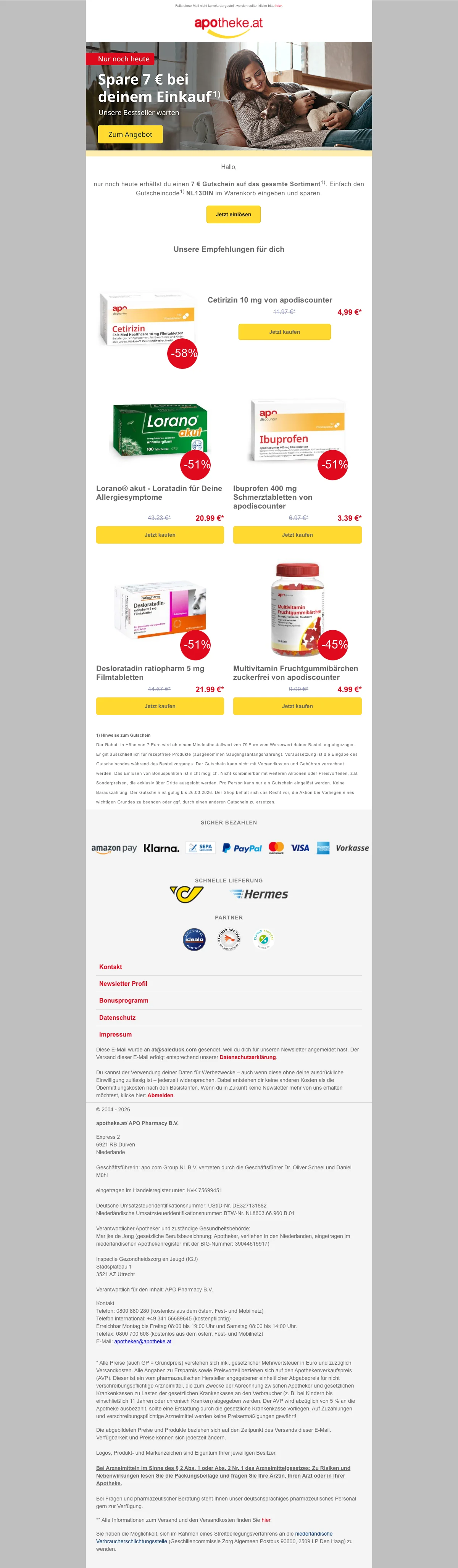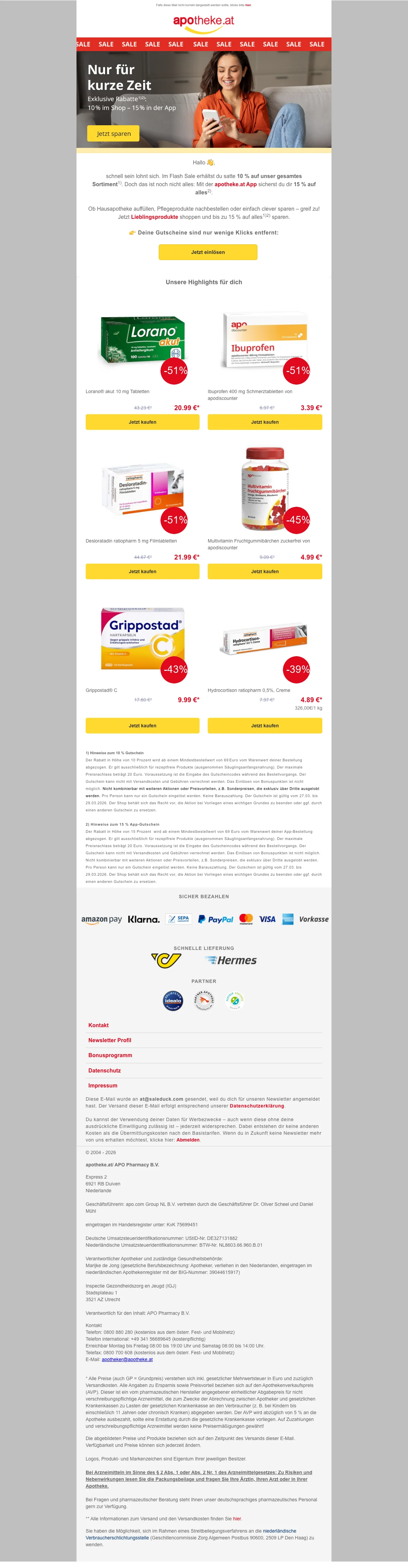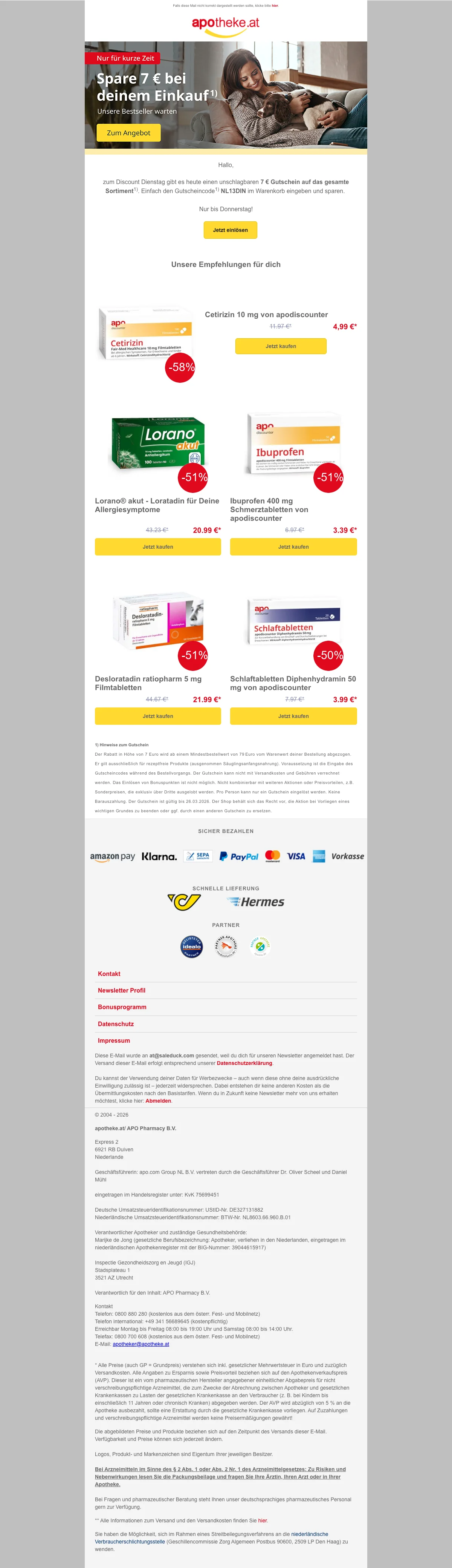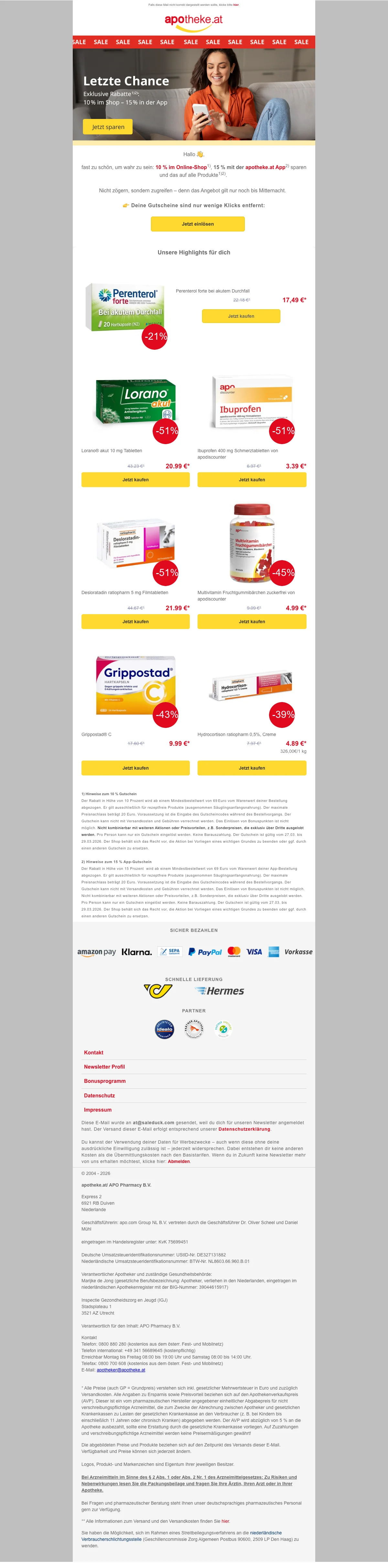 Saleduck ist ein unabhängiger, werbefinanzierter Gutschein-Vergleichsdienst. Die Angebote auf dieser Website stammen von Unternehmen, von denen Saleduck eine Vergütung erhält. Diese Vergütung kann sich darauf auswirken, wie und wo Gutscheine oder Produkte auf dieser Website erscheinen, einschließlich beispielsweise der Reihenfolge, in der sie innerhalb der Auflistungskategorien erscheinen. Saleduck hat direkte Verträge mit den von uns beworbenen Werbetreibenden. Wir veröffentlichen nur Gutscheine, die wir direkt vom Werbetreibenden erhalten oder wenn der Werbetreibende selbst für sie wirbt. Wir veröffentlichen keine Gutscheine von anderen Websites erneut. Saleduck überprüft die Gutscheine manuell, bevor sie veröffentlicht werden.