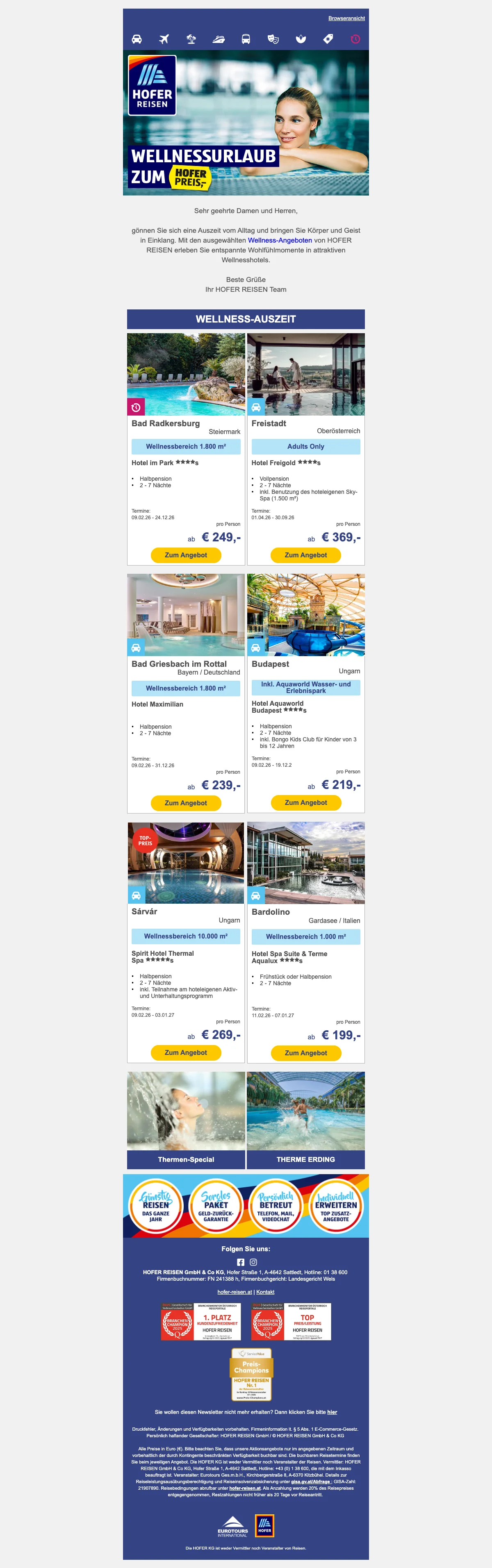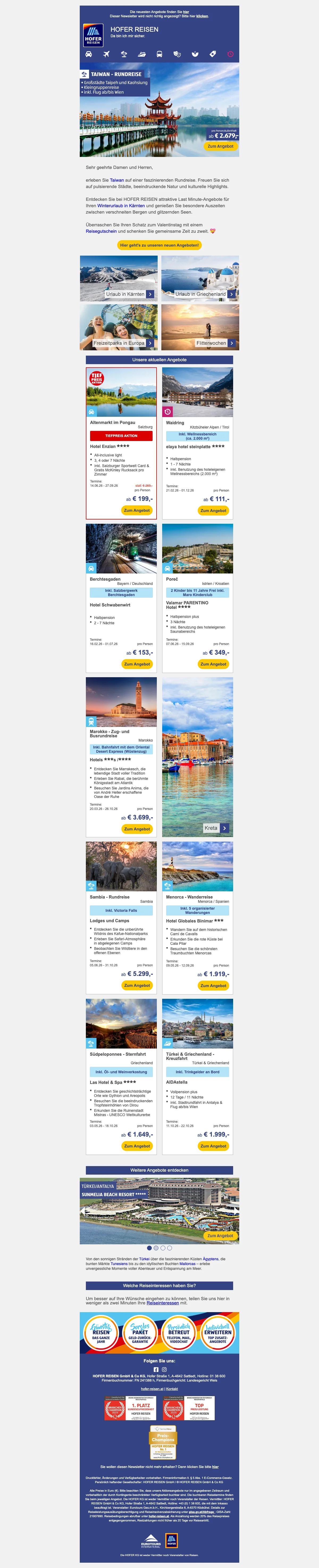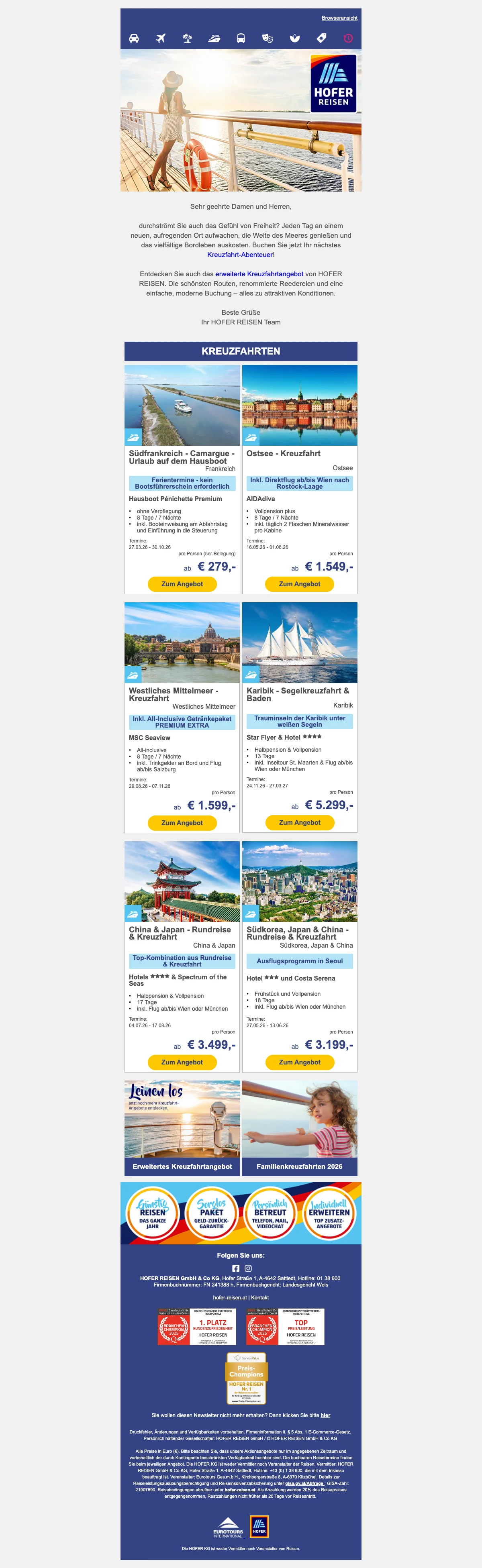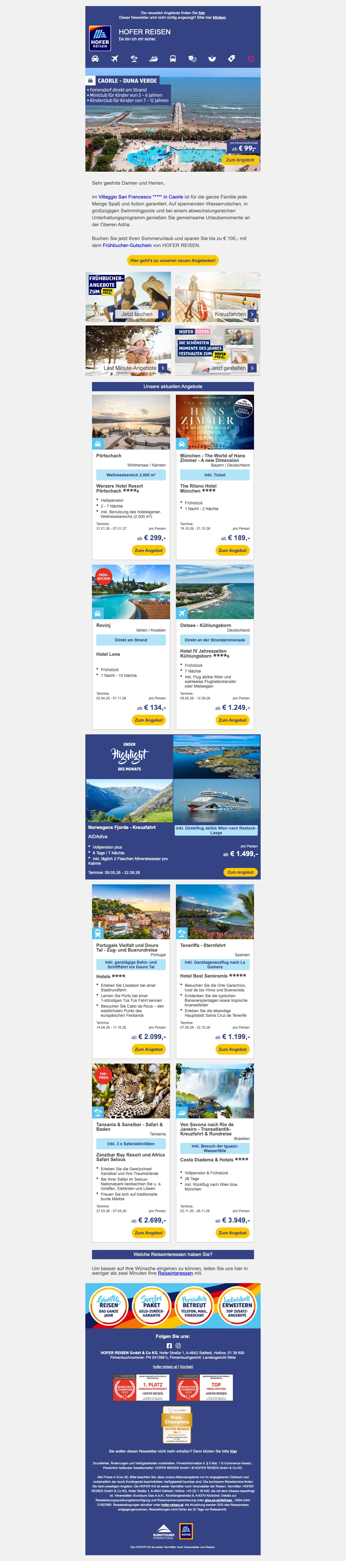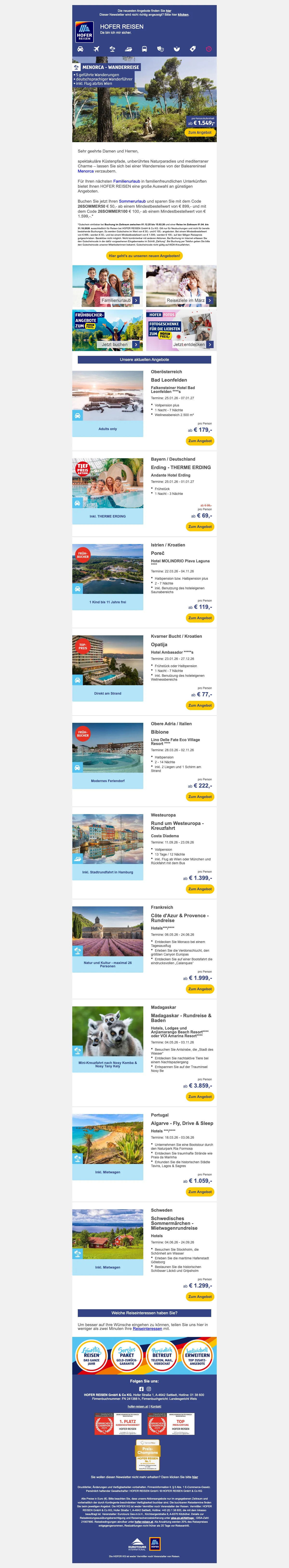 Bei der Reiseplattform kannst du entweder online auf hofer-reisen.at oder in einem der Reisebüros z.B. in Wien oder Salzburg bequem und günstig deinen Urlaub online buchen. Hier findest du günstige Urlaubsangebote für Flugreisen, Pkw-Reisen, Rundreisen, Fernreisen, Kreuzfahrtreisen, Städtereisen, Familienreisen und Reisen zu speziellen Veranstaltungen wie Konzerte oder Musicals.