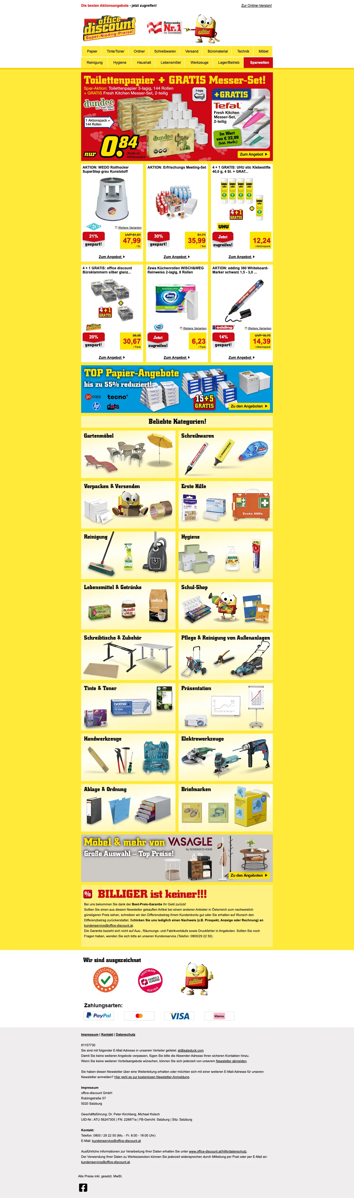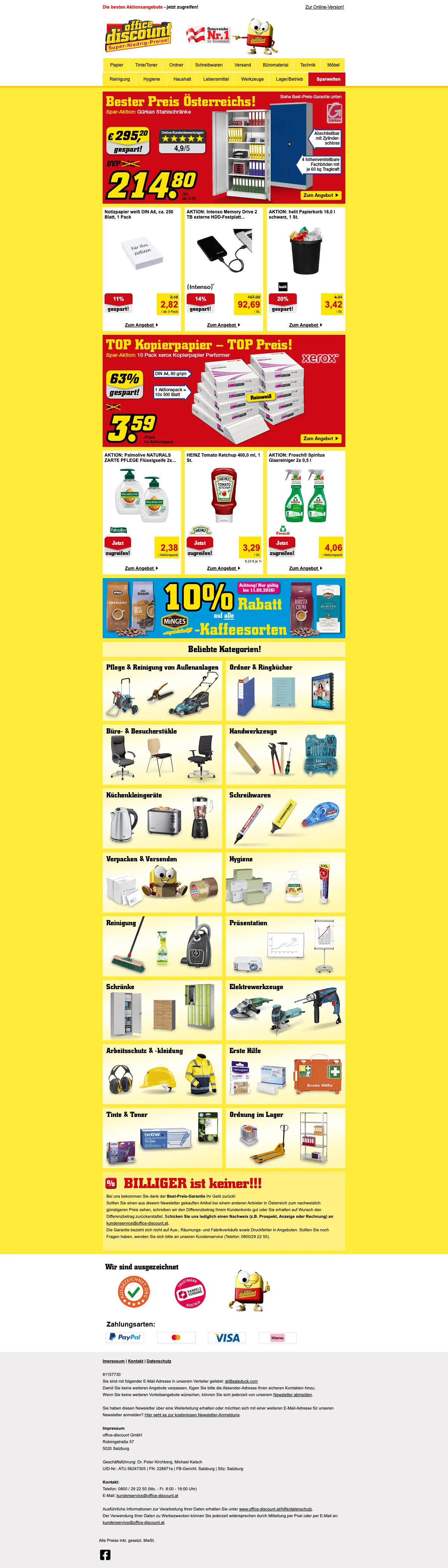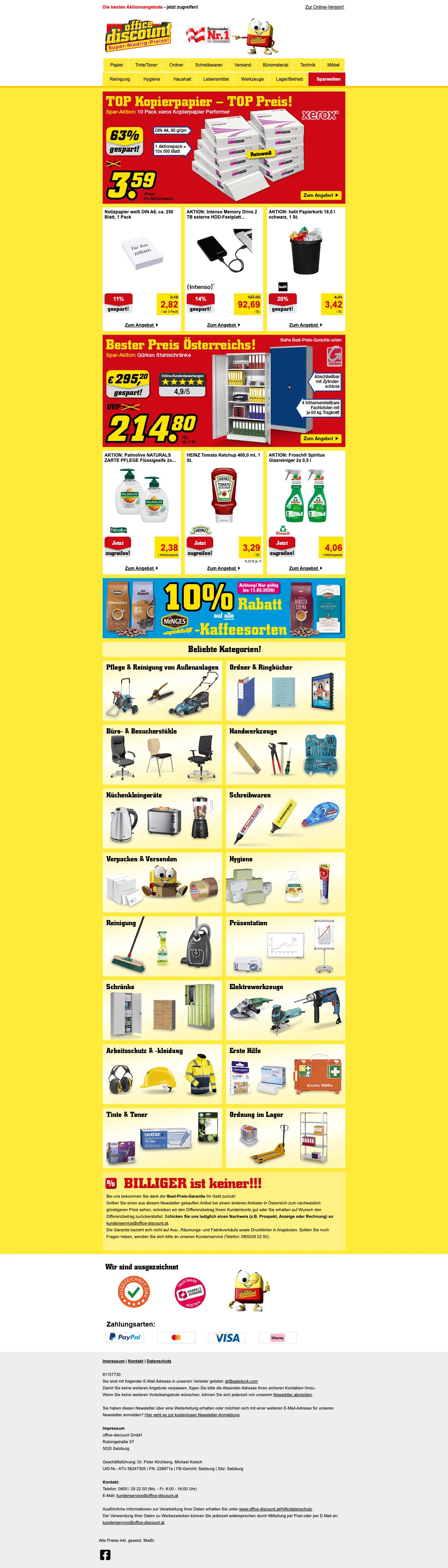 Aufgepasst! Bei Office Discount findest du den günstigen Bürobedarf. Ob Büromöbel, Schreibwaren, Kopierpapier, Toner oder Technik - bei Office Discount im Online Shop wirst du alles finden. Schaue in der Angebots-Kategorie vorbei und entdecke da eine große Auswahl an einzigartigen Artikeln mit bis zu 60 % Rabatt. Schau bei office-discount.at vorbei und schlag zu!