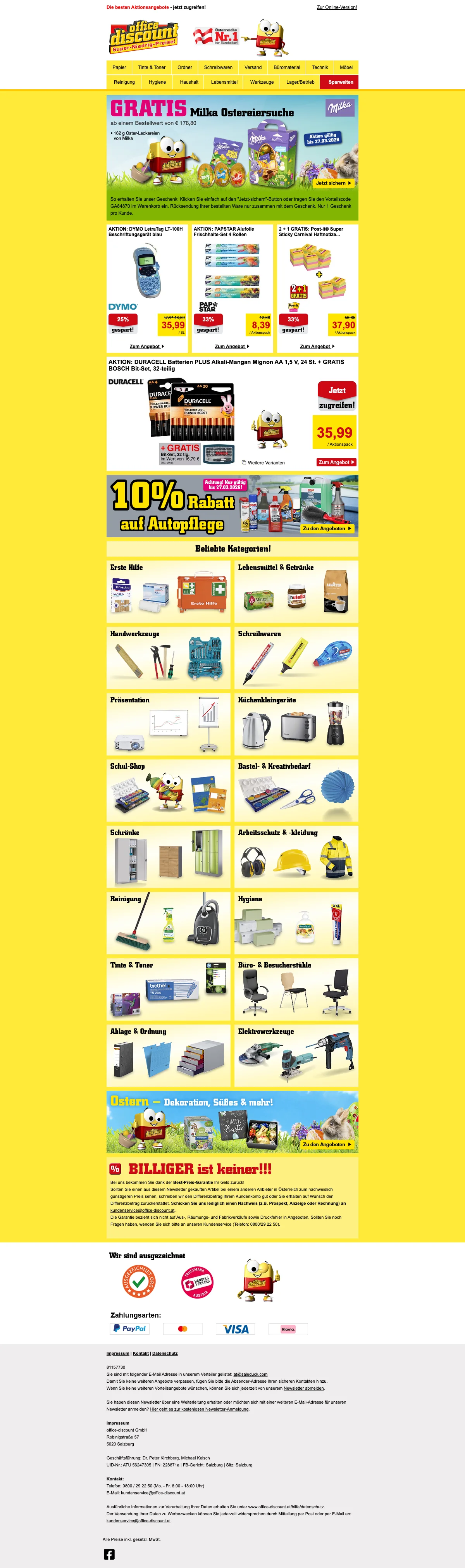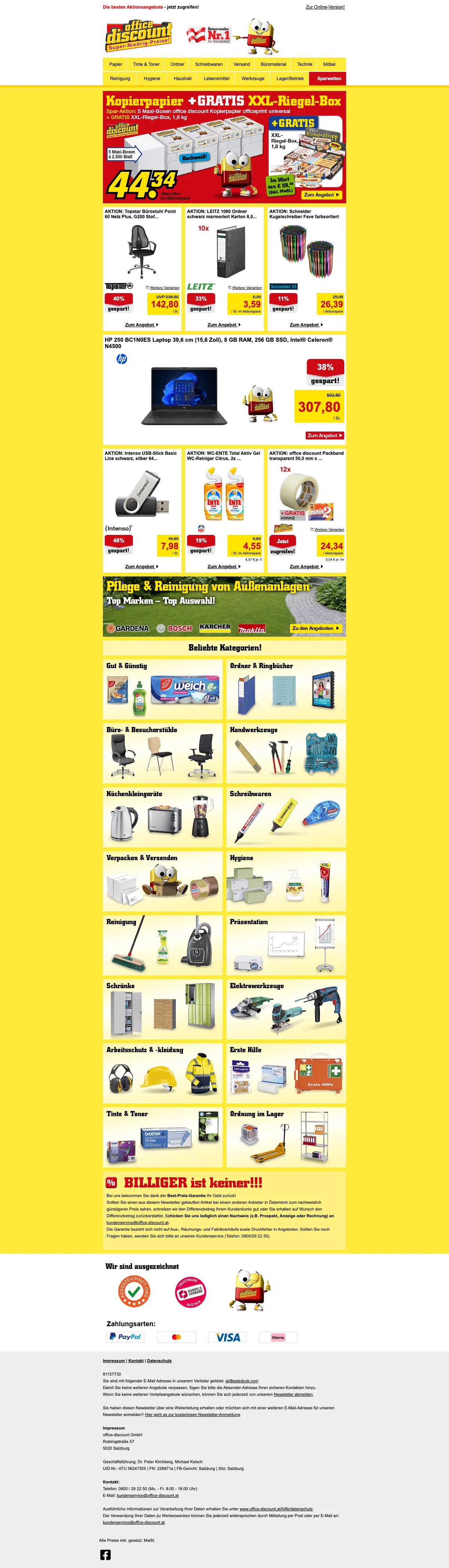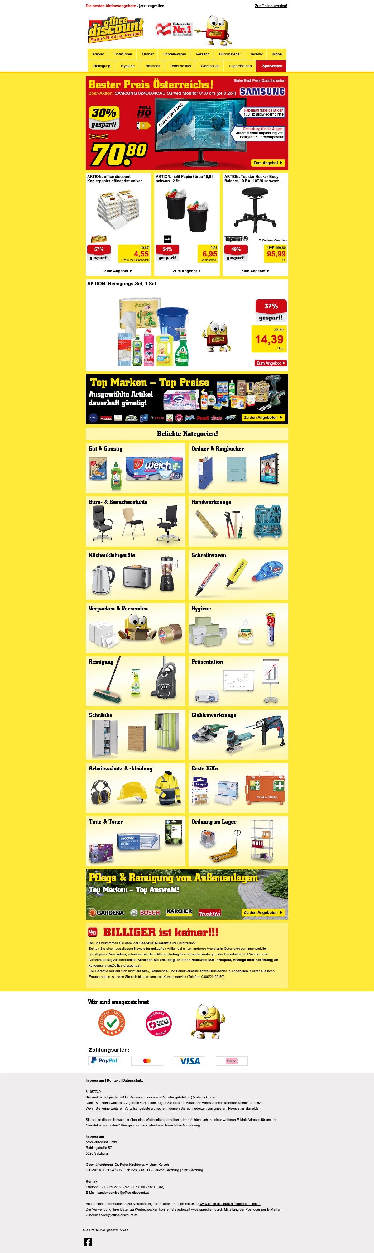 Aufgepasst! Bei Office Discount findest du den günstigen Bürobedarf. Ob Büromöbel, Schreibwaren, Kopierpapier, Toner oder Technik - bei Office Discount im Online Shop wirst du alles finden. Schaue in der Angebots-Kategorie vorbei und entdecke da eine große Auswahl an einzigartigen Artikeln mit bis zu 60 % Rabatt. Schau bei office-discount.at vorbei und schlag zu!