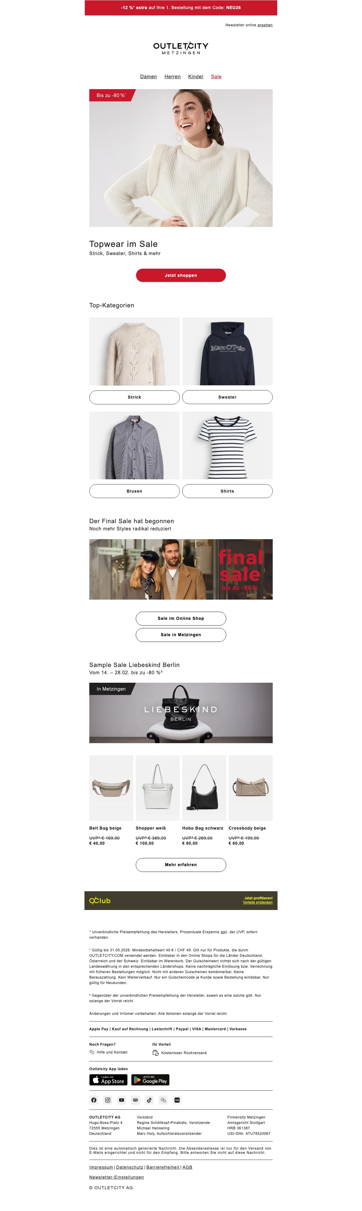 Mode-Outlets erfreuen sich immer größerer Beliebtheit beim Kleidungskauf. Den hier kann man Marken- und Designerkleidung richtig günstig ergattern. So auch bei Outletcity, dem Outlet Metzingen. Hier kannst du in über 70 Premium- und Luxusmarken schwelgen. Aber nicht nur Mode gibt es bei Outletcity Metzingen, sondern auch edle Parfüms, Uhren und Schmuck, Outdoor-Artikel sowie Wohnungsdeko und Reisezubehör und eine große Spielwarenrubrik. Das alles von erstklassigen Marken und zu unsagbar günstigen Preisen. In den über 60 Filialen von Outletcity Metzingen werden Premium-Produkte mit mindestens 30% Preisnachlass gegenüber der UVP angeboten, zuweilen werden Artikel in besonderen Sale-Aktionen sogar bis zu 70% reduziert. Die Versandkosten nach Österreich betragen pauschal 2,90 Euro, die Rücksendung ist kostenlos. Wenn du Lust hast, bei Outletcity einzukaufen, wähle einfach die passende Kategorie oder auch direkt deine Lieblingsmarke aus dem Menü, und los geht der Einkaufsspaß.