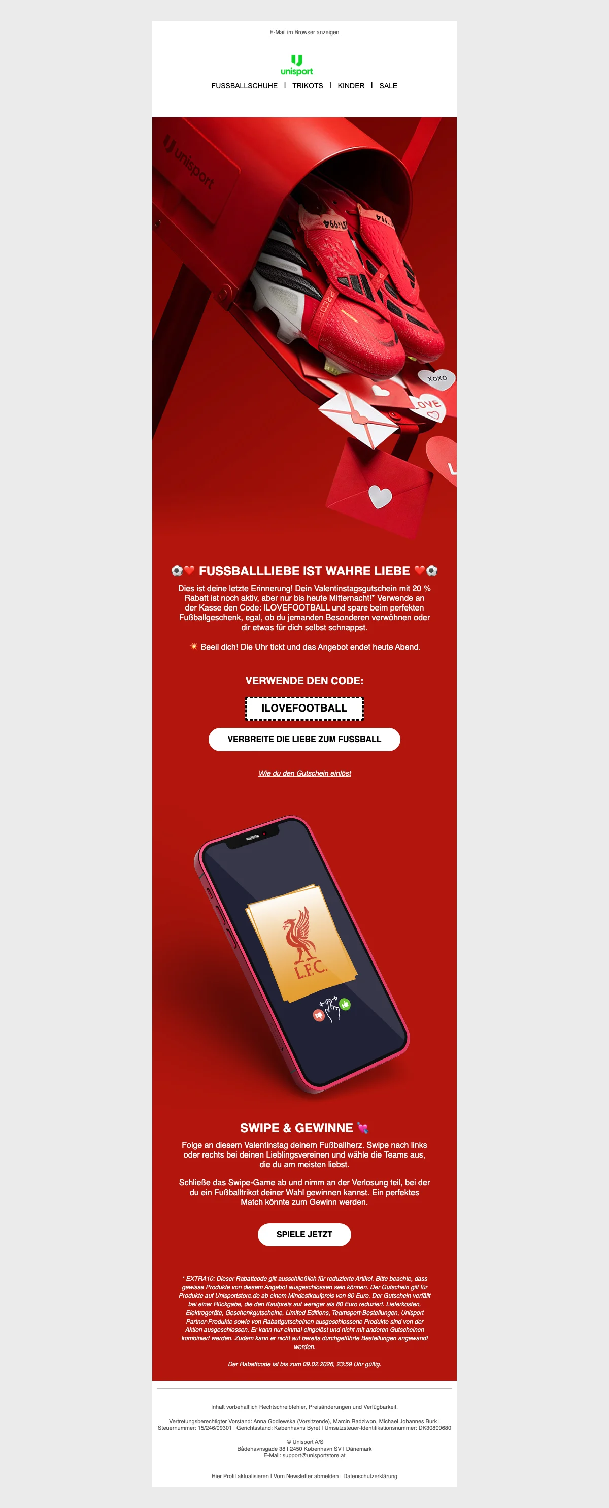 Deine Kinder lieben Fußball? Dann bist du bei UNISPORT genau richtig! Besuche den Onlineshop und spare jetzt im Sale bis zu 50 %. Das Sortiment umfasst unter anderem Kinder-Fußballschuhe, Fußball Trikots, Hallenschuhe, Laufschuhe & Sneaker, Trainingshosen & Trainingsbekleidung, Baselayer und Fußbälle. Gleich die besten Angebote schnappen!